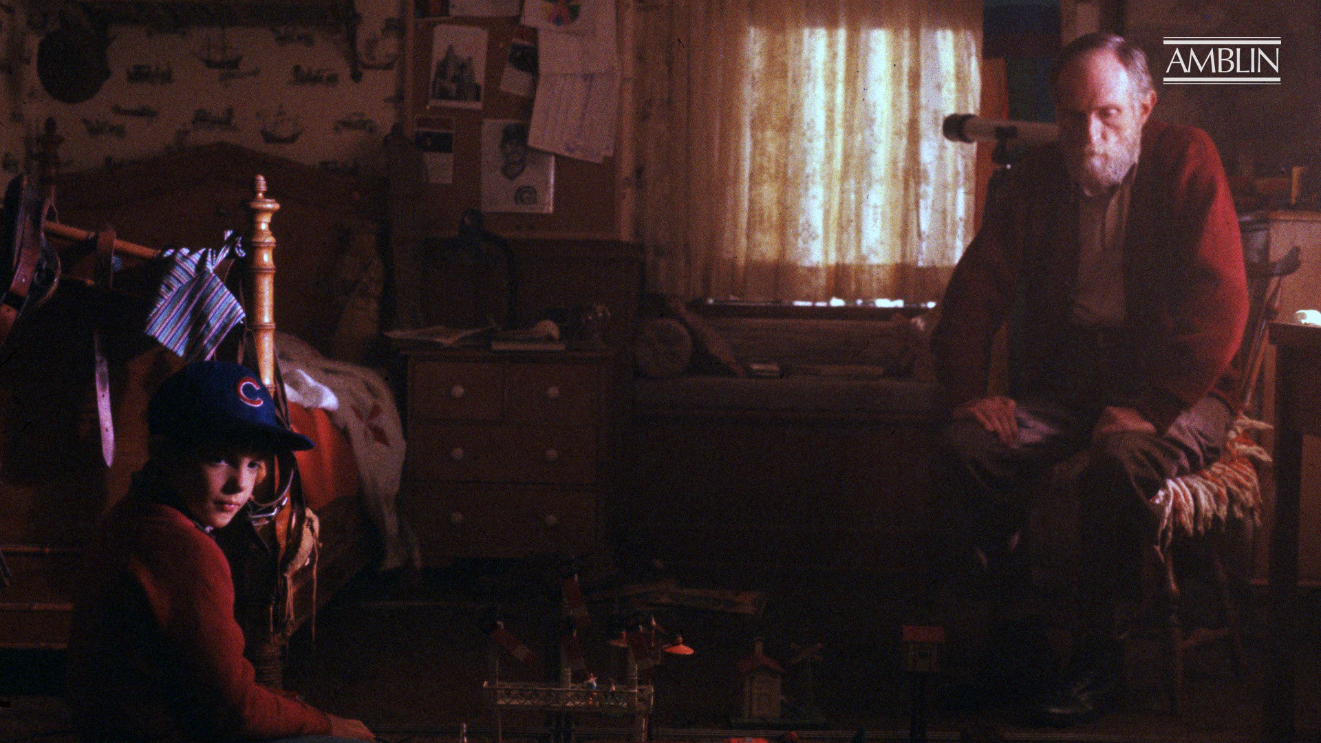 Brian (Lukas Haas, left) sits with his Opa (Roberts Blossom), who tells the young boy a tale of The Highball Express, a ghost train the old timer is convinced will return to carry him on to his destiny. From "Ghost Train," from a story by and directed by Steven Spielberg.