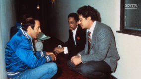 Director Peter Hyams (left) consults with his actors Gregory Hines (center) and Richard Masur (right) between setups on "The Amazing Falsworth."